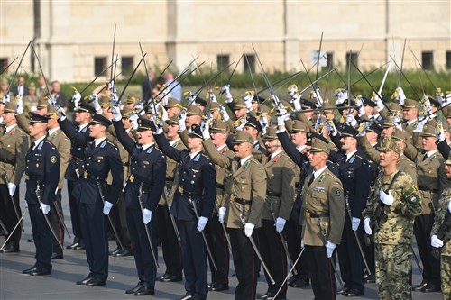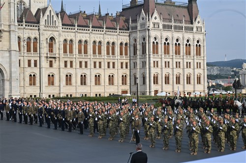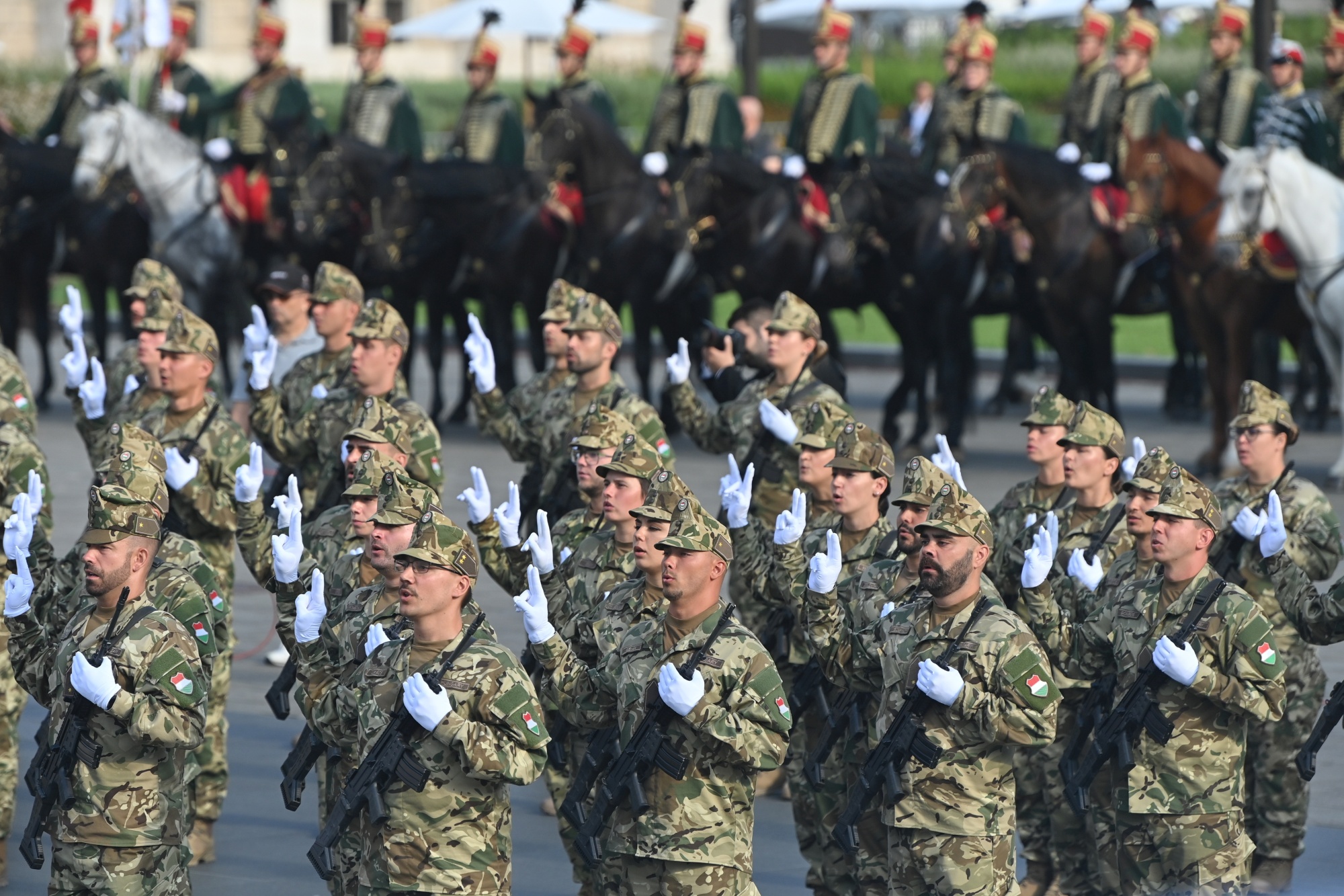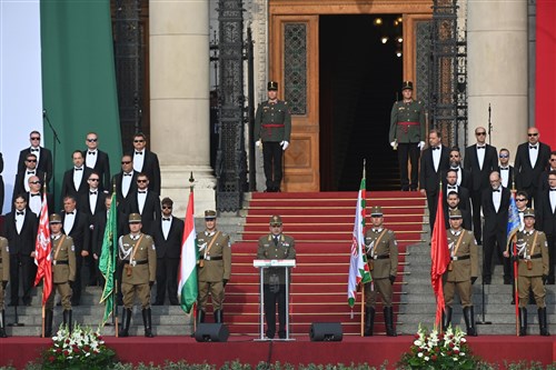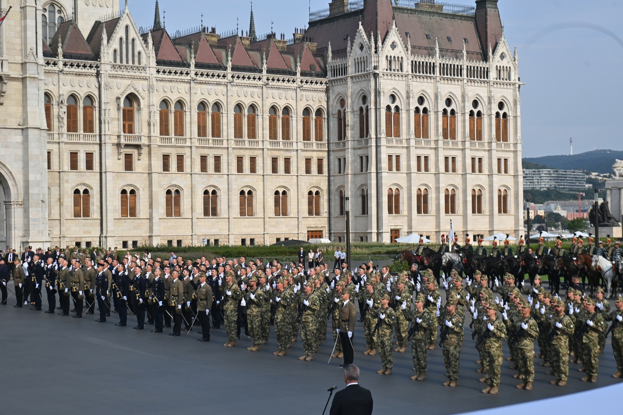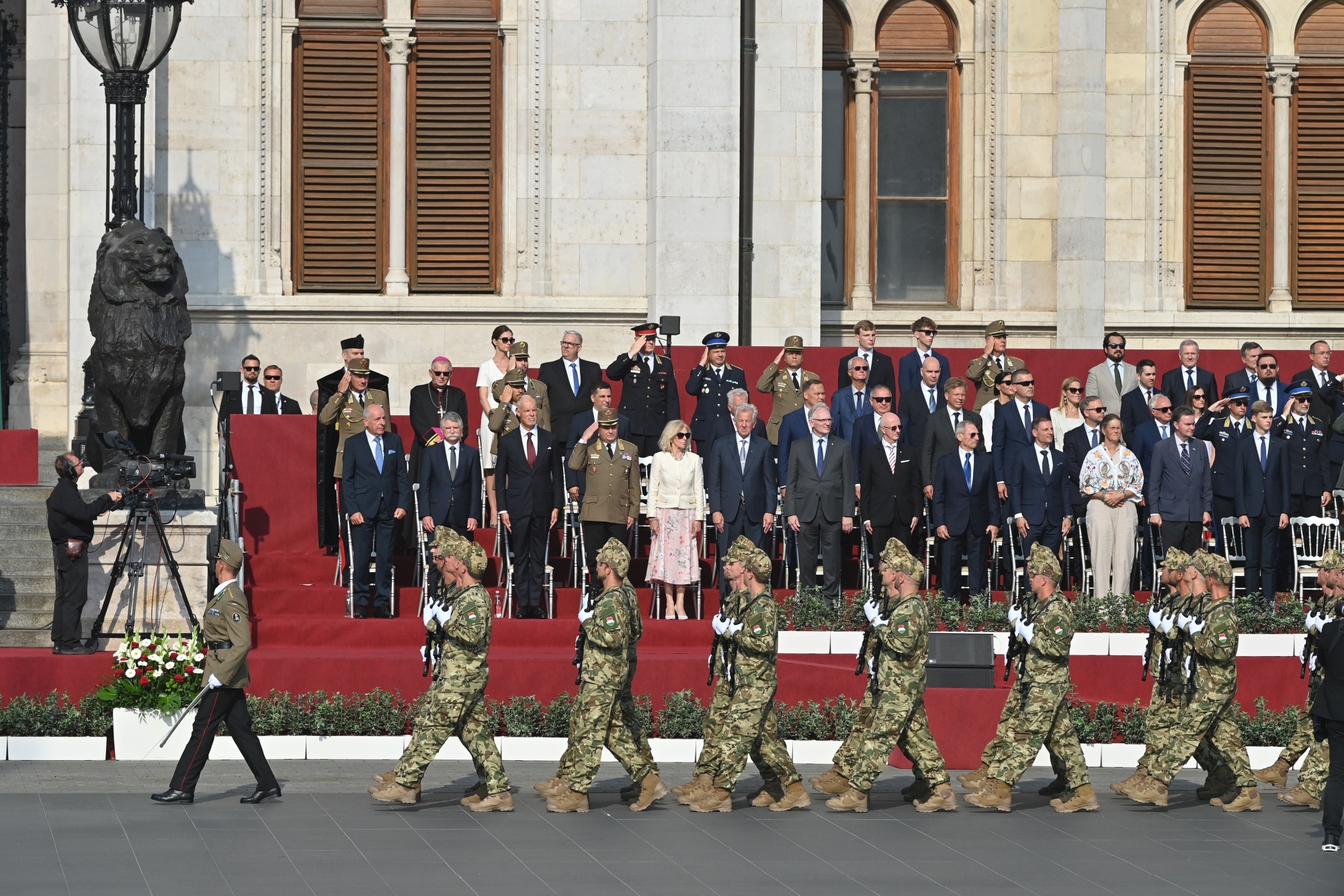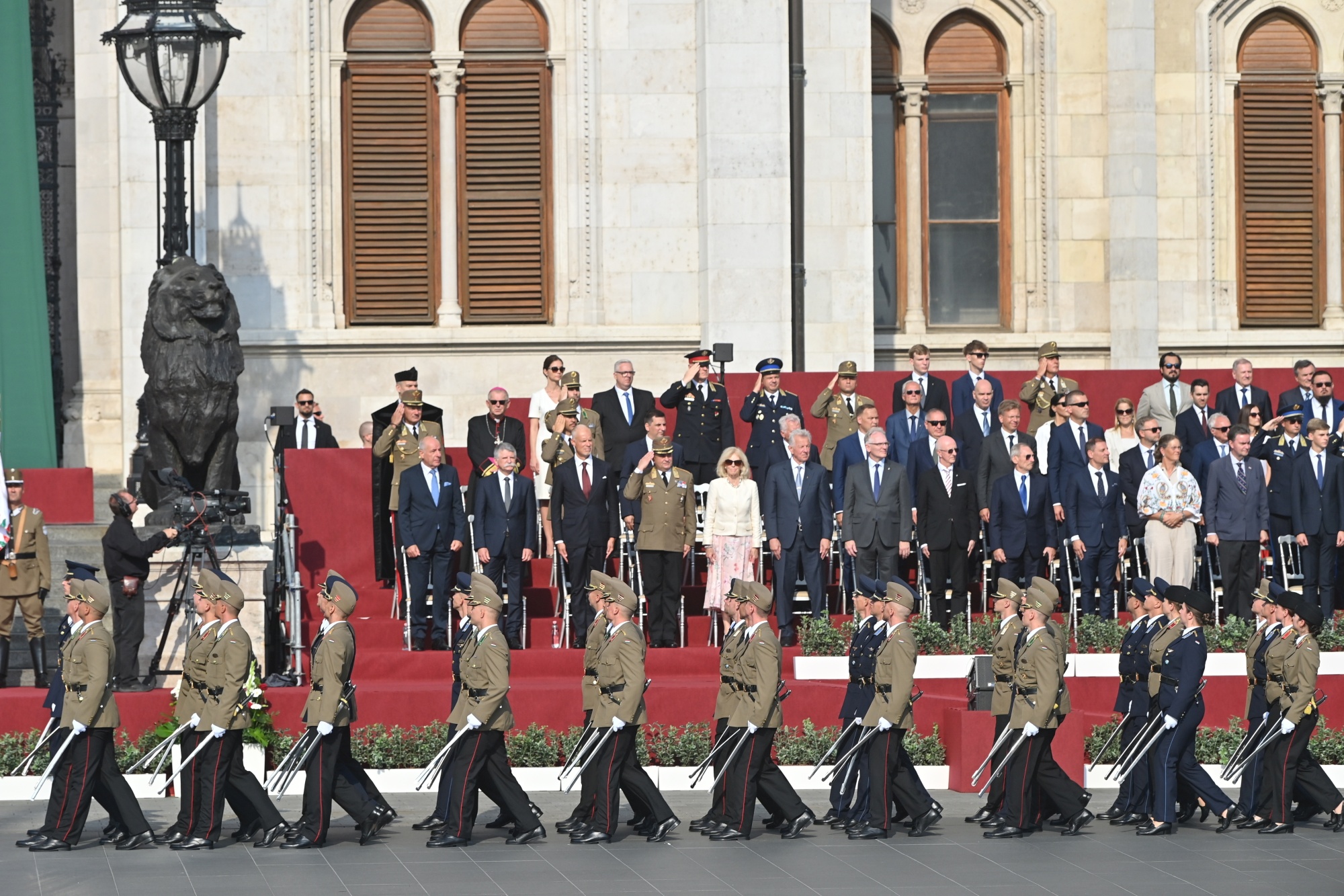 Az esküt tett katonák díszmenete a tisztavatás után. Az emelvényen Sulyok Tamás köztársasági elnök (b), Kövér László, az Országgyűlés elnöke (b2), Szalay-Bobrovniczky Kristóf honvédelmi miniszter (b3), Böröndi Gábor vezérezredes, a Honvéd Vezérkar főnöke (b4), Schmitt Pál korábbi köztársasági elnök (b6) és felesége, Makrai Katalin (b5), valamint Juhász Imre, az Alkotmánybíróság elnöke (b7), Varga Zs. András, a Kúria elnöke (b8), Pintér Sándor belügyminiszter (b9), Tuzson Bence igazságügyi miniszter