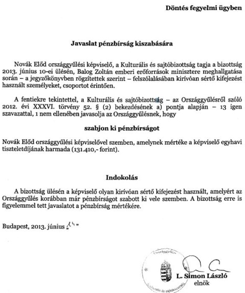 A parlament kulturális bizottsága Novák Előd egyhavi tiszteletdíjának harmadát kitevő pénzbírság kiszabását javasolta Kövér László házelnöknek, ez 131 ezer 410 forintot jelent. Az indoklás szerint a jobbikos politikus, a bizottság tagja, a testület június 10-i ülésén "olyan kirívóan sértő kifejezést használt személyeket, csoportot érintően, amelyért az Országgyűlés korábban már pénzbírságot szabott ki vele szemben". Az indoklás szerint ez is közrejátszott a bírság mértékének megállapításában.