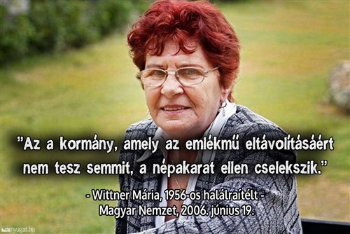 Szegény Wittner Mária, a Fidesz korábbi országgyűlési képviselője, 56-os halálraítélt sem értheti, mit csinál a kormány, hiszen ellenzékben harsányan követelték az emlékmű eltávolítását. Marika néni 2006-ban a kormányközeli Magyar Nemzetnek így fogalmazott: