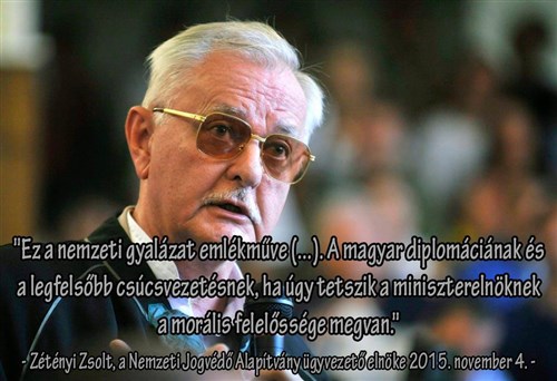 Suszter maradjon a kaptafánál, hangzik a szólás, nemzetközi egyezmények, egyáltalán, a jog kapcsán hivatkozzunk jogászokra. Dr. Zétényi Zsolt, a Nemzeti Jogvédő Alapítvány (NJA) ügyvezető elnöke korábban már egy 55 oldalas tanulmányában ízekre szedte a témát. Az értelmiségiekből álló Százak Tanácsa Közhasznú Egyesület képviseletében eljárva pedig maga kezdeményezte az emlékmű elhelyezését, ám a Külügyminisztérium elzárkózott az ötlettől.