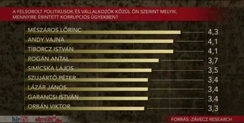 „A magyar kormányhoz közel álló vállalkozók, illetve maguk a kormány tagjai valamilyen módon érintettek, közepesnél nagyobb mértékben. Ennek a listának az élén három személy van, akik 4-es értéket érnek el az osztályozásban. Ezek sorrendben Mészáros Lőrinc, "Andy" Vajna és Tiborcz István. Nyilván utóbbi személy az Európai Csalás Elleni Hivatal (OLAF) mostani jelentéseinek köszönhetően került az érdeklődés középpontjába. Tehát ez a három személy olyan, akikről azt gondolja a magyar társadalom többsége, hogy korrupciós ügyekben érintettek” – mondta a kutatási igazgató a Hír TV-nek.
