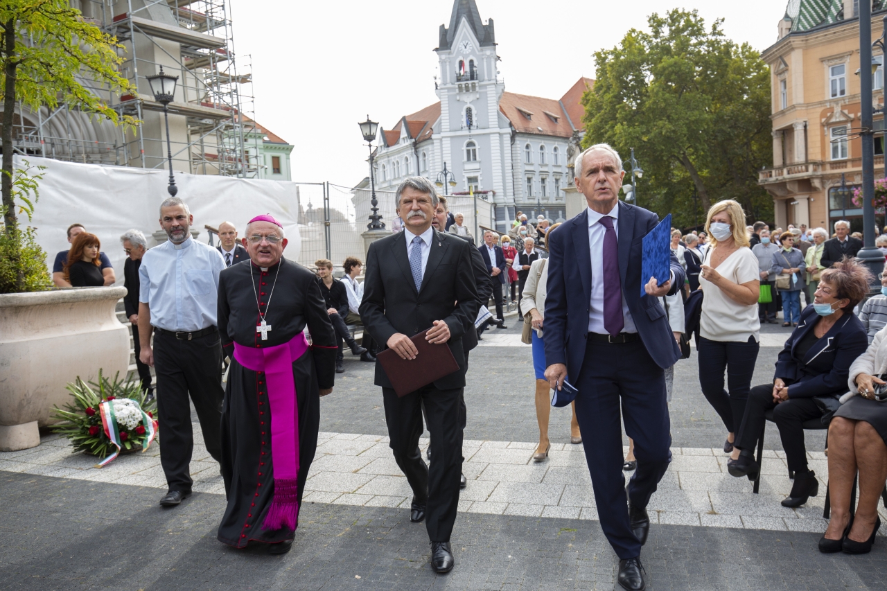 Varga László megyéspüspök (b2), Kövér László, az Országgyűlés elnöke (k) és Szita Károly polgármester (j) érkezik Márton Áron (1896-1980) erdélyi római katolikus püspök szobrának avatására Kaposváron, a Kossuth téren 2020. október 3-án