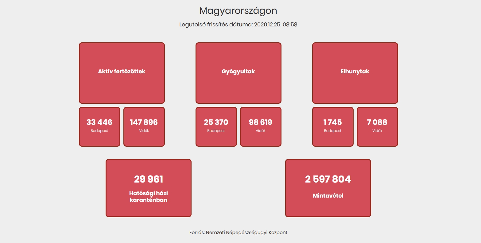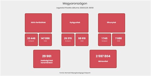 Az elhunytak száma 8833, a gyógyultaké 123 989. Az aktív fertőzöttek száma 181 342. Az aktív fertőzöttek 18 százaléka, az elhunytak 20 százaléka, a gyógyultak 20 százaléka budapesti. Kórházban 6006 koronavírusos beteget ápolnak, közülük 489-en vannak lélegeztetőgépen. Hatósági házi karanténban 29 961-en vannak, a mintavételek száma 2 597 804-re emelkedett.