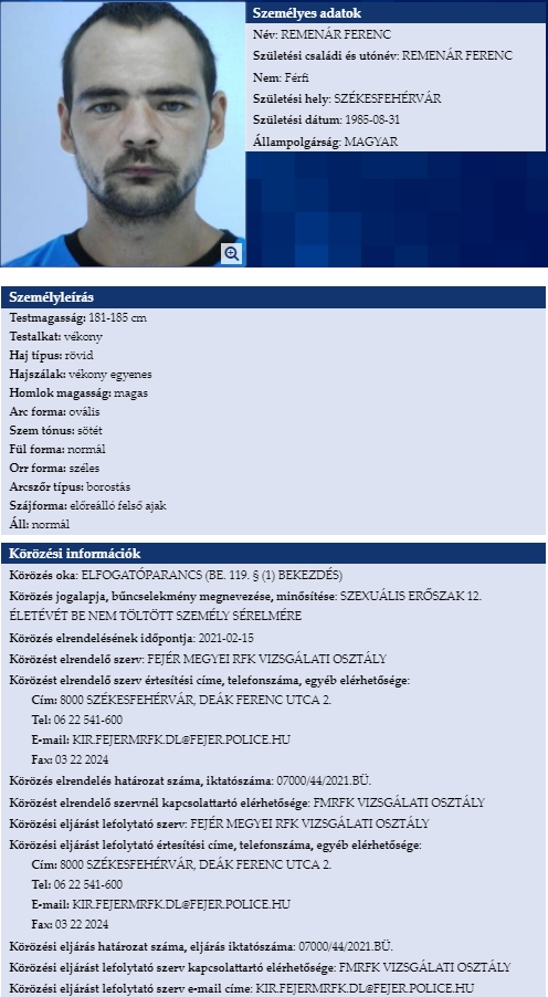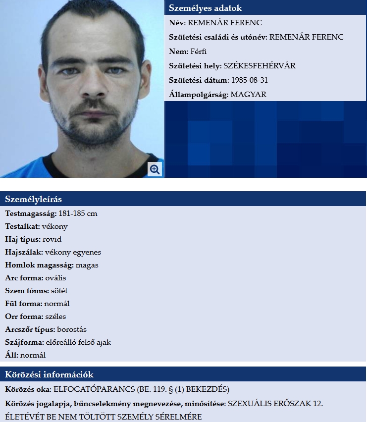 Remenár Ferencnek hívják. A 35 éves gyanúsítottat 12. életévét be nem töltött gyerekkel szembeni szexuális erőszak miatt keresi a rendőrség.
