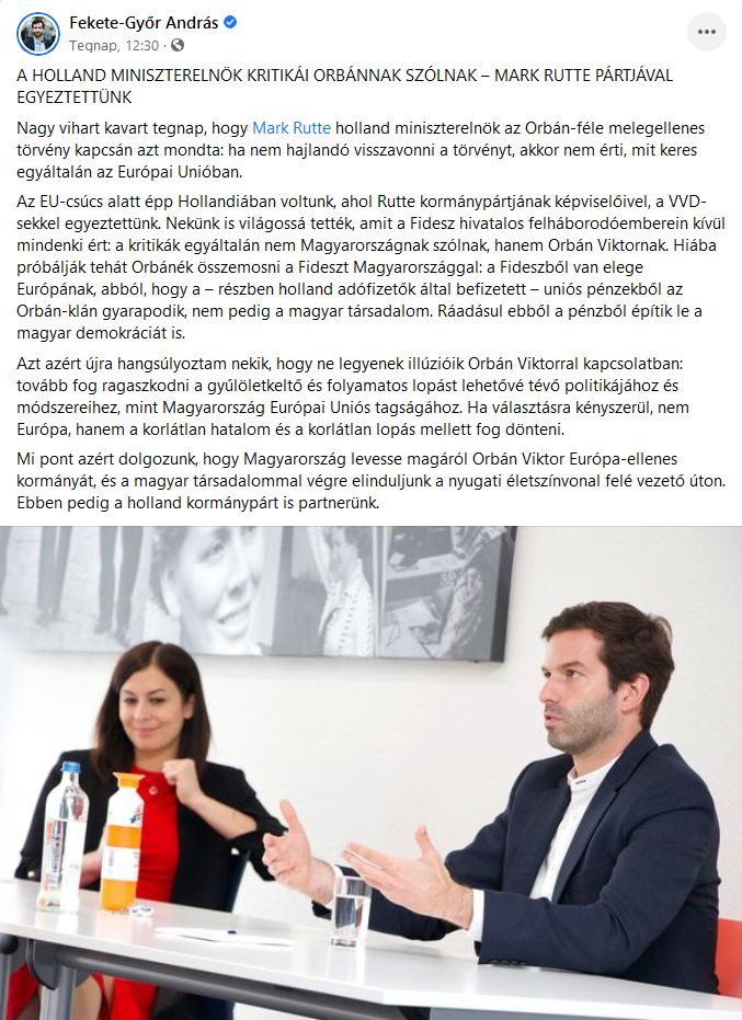 A posztját azzal zárta, hogy azért dolgoznak, hogy „Magyarország levesse magáról Orbán Viktor Európa-ellenes kormányát, és a magyar társadalommal végre tényleg elinduljunk a nyugati életszínvonal felé vezető úton”. A holland kormányt pedig partnerük ebben – állítja Fekete-Győr András.