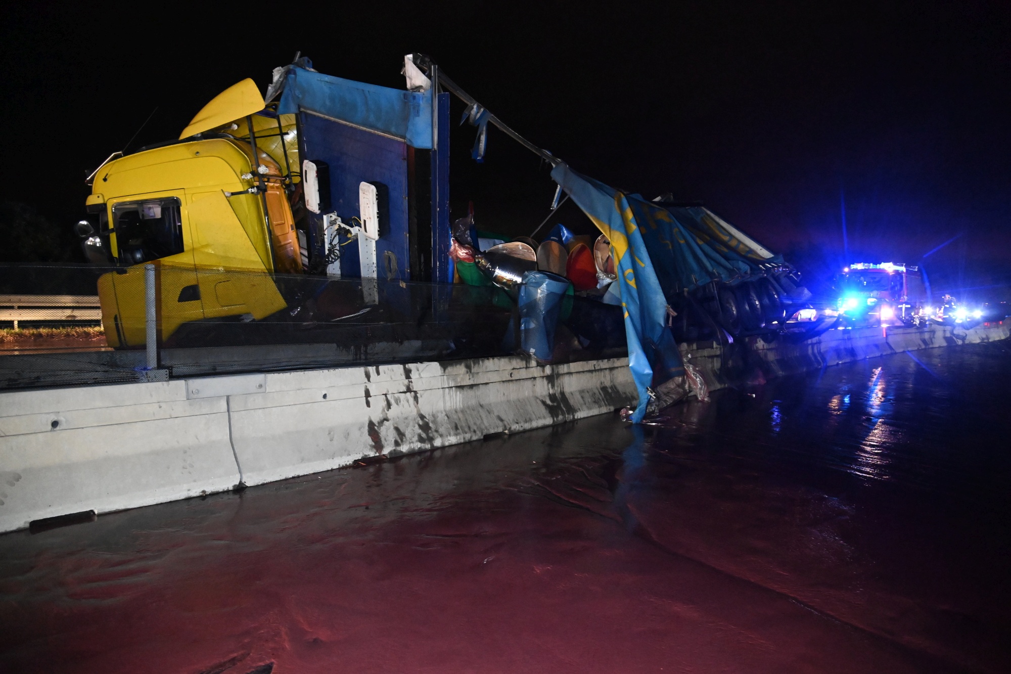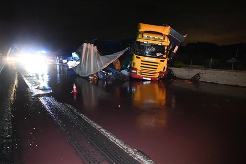 Átszakította a szalagkorlátot és felborult a vontatmánya egy meggylevet szállító kamionnak az M3-as autópályán Mogyoródnál, a 200 literes hordókban szállított gyümölcslé mindkét irányban elárasztotta az úttestet - közölte a Pest Megyei Katasztrófavédelmi Igazgatóság szóvivője az MTI-vel.