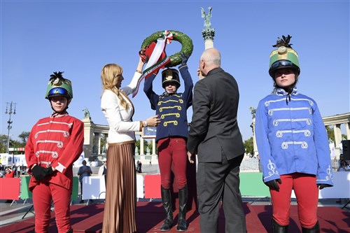 Szabó Tünde, az Emberi Erőforrások Minisztériumának sportért felelős államtitkára és Medveczky Balázs, a Duna Televízió csatornaigazgatója átadja a koszorút a győztes Hajdu Fanninak (k) a Kishuszár Vágta döntője után (fotók: MTI/Kovács Tamás)