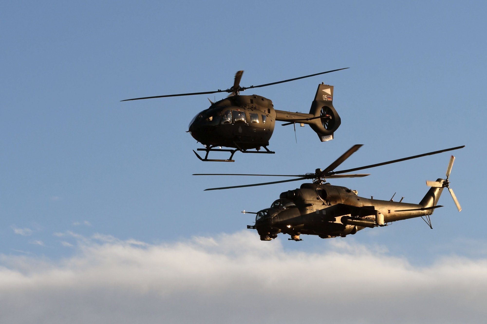 Az utolsó H145M típusú könnyű, többcélú helikopter (b) érkezik MI24-es helikopter kíséretében Németországból, az Airbus donauwörthi bázisáról az MH 86. Szolnok Helikopter Bázisra 2021. december 3-án