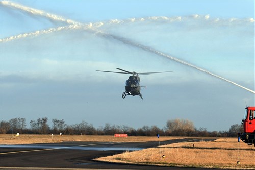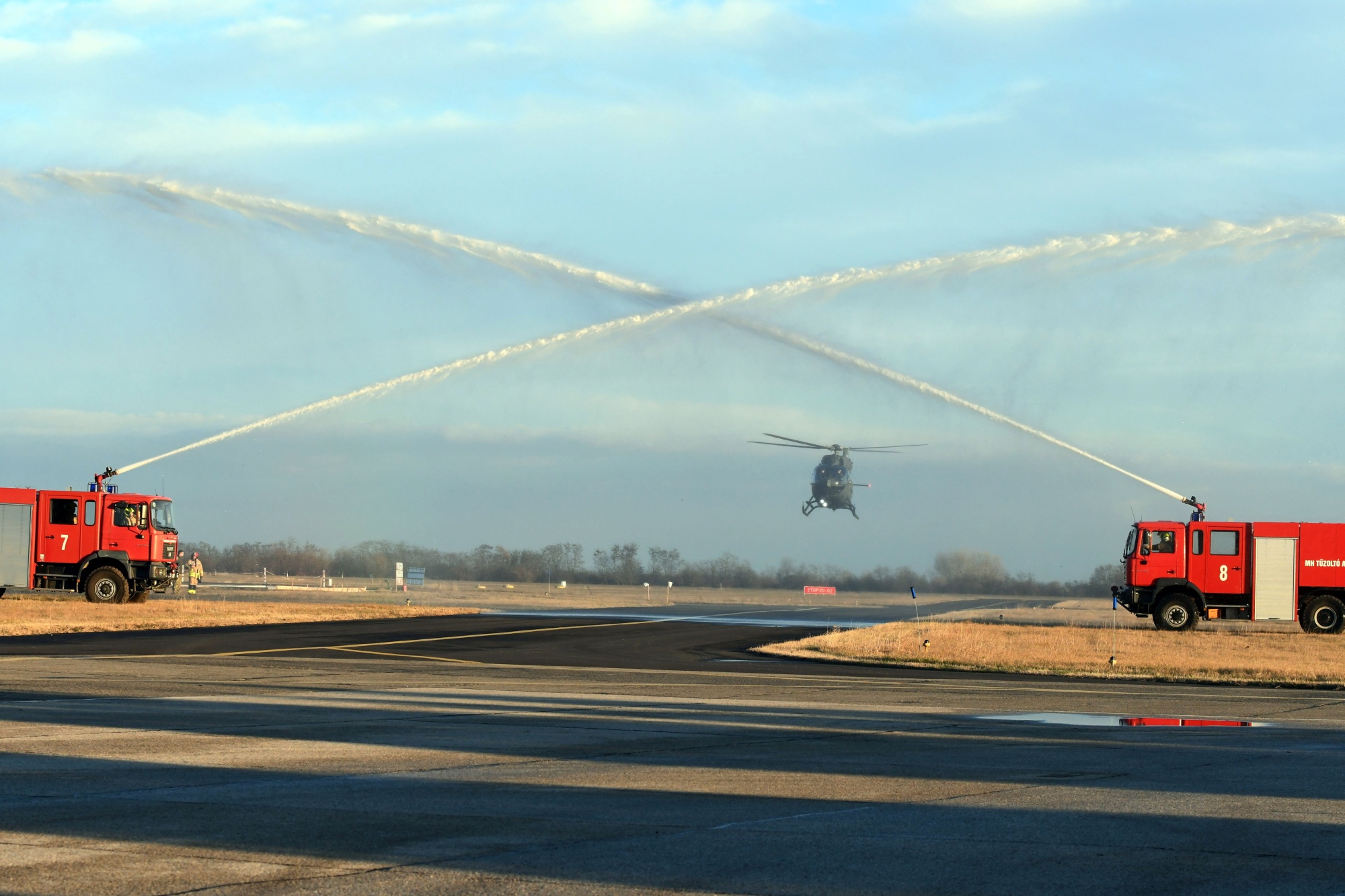 A H145M típusú helikopter kötelékben érkezett egy Mi-17-es és egy Mi-24-es helikopterrel, majd az Airbus-gépet vízágyúval köszöntötték Szolnokon, ahol a helikopterbázis állományának egy része fogadta.