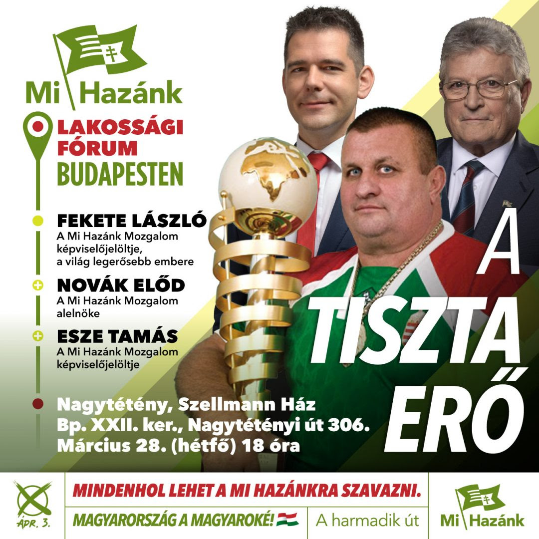 Az immár a Mi Hazánkat erősítő Fekete László a tiszta erőt képviseli, a Natúr Erős Emberek Szövetsége tagjaként – a doppingoló élsportolókkal szemben – nemcsak az erőt, hanem az egészséget és a tisztességet is szem előtt tartja.