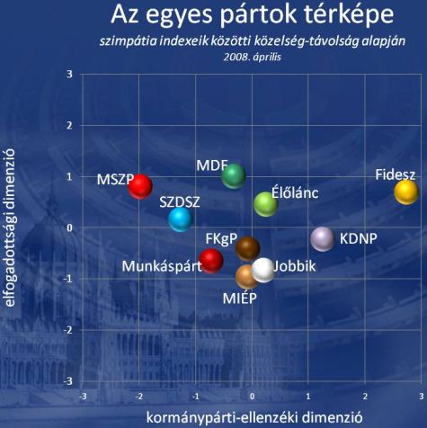 2008. áprilisi országos közvéleménykutatásában a Forsense és a Századvég választáskutatási programjában a pártválasztásra vonatkozó hagyományos kérdéseken túl tíz párt esetében egyenként megkérdezte a mintába kerülteket, hogy mennyire érzik magukhoz közel állónak az adott pártot. A kérdezettek mindegyik esetben egy ötfokú skálán osztályozhattak, ahol az 1-es azt jelentette, hogy nagyon távol áll tőle az adott párt, az 5-ös pedig azt, hogy nagyon közel áll. A kérdésekre adott válaszok nem csak a jelenlegi preferenciák feltárására alkalmasak, hanem a tavaly szeptemberi országos felmérésünk hasonló eredményeivel történő összehasonlításra is.