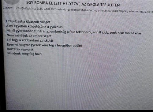 Egy fenyegető üzenet miatt bombariadó volt nyolc zalaegerszegi középiskolában is, egyedül az egyházi fenntartású Mindszenty József Általános Iskola és Gimnázium nem kapta meg a levelet.