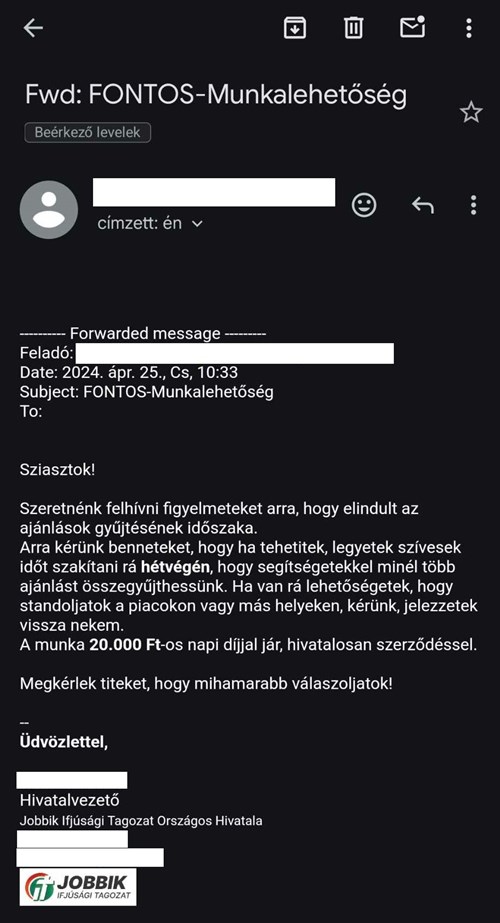 Egy belső jobbikos levelezésből kiderült, napi 20 ezer forintért próbálnak aktivistákat toborozni. A levél nem csak Szegedre vonatkozik, hanem az egész országra.