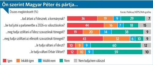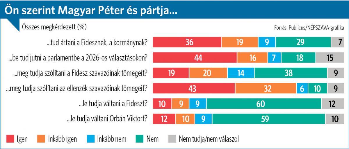 Arra a kérdésre, hogy Magyar Péter és pártja képes-e ártani a Fidesznek és a kormánynak, a kutatásban megkérdezettek összesen 55 százaléka igennel vagy inkább igennel reagált, 38 százalék viszont ellenkezőképpen gondolkozik (a többiek nem válaszoltak). A többség – 60 százalék – szerint a Tisza Párt be tud jutni a parlamentbe a 2026-os választásokon, ezzel a válaszadók 25 százaléka nem ért egyet. Abban viszont már jóval kevesebben hisznek, hogy képes megszólítani a Fidesz szavazóinak tömegeit – erre a kérdésre 39 százalék felelt igennel, 52 százalék viszont inkább nemmel reagált.