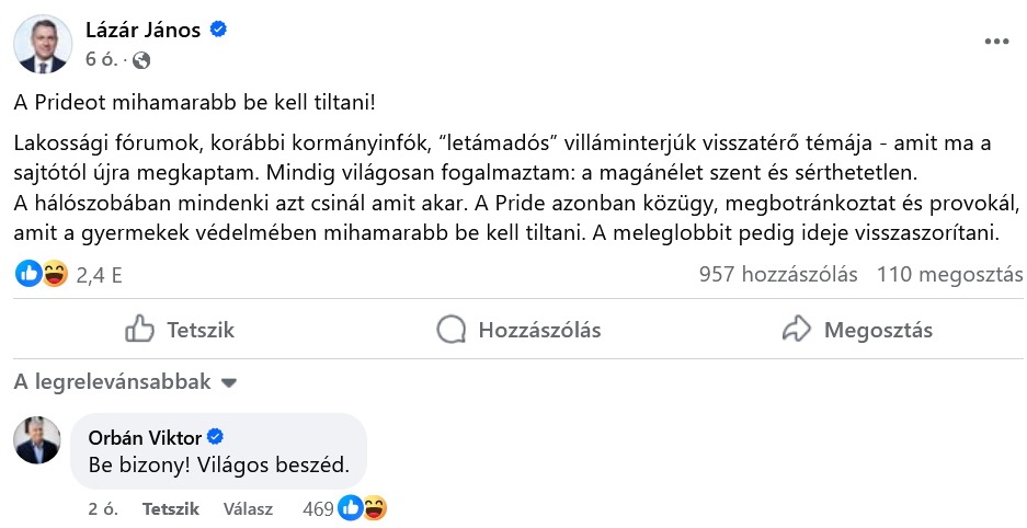 A magánélet szent és sérthetetlen. A hálószobában mindenki azt csinál, amit akar. A Pride azonban közügy, megbotránkoztat és provokál, amit a gyermekek védelmében mihamarabb be kell tiltani. A meleglobbit pedig ideje visszaszorítani – írja Facebook-oldalán Lázár János.
