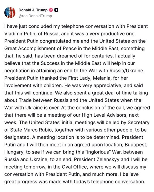 Donald Trump amerikai elnök közölte: „nagyon eredményes” telefonbeszélgetést folytatott Vlagyimir Putyin orosz elnökkel csütörtökön, „nagy előrehaladást” említett az orosz–ukrán háború lezárásának ügyében. A beszélgetésről a Truth Social-felületén számolt be.