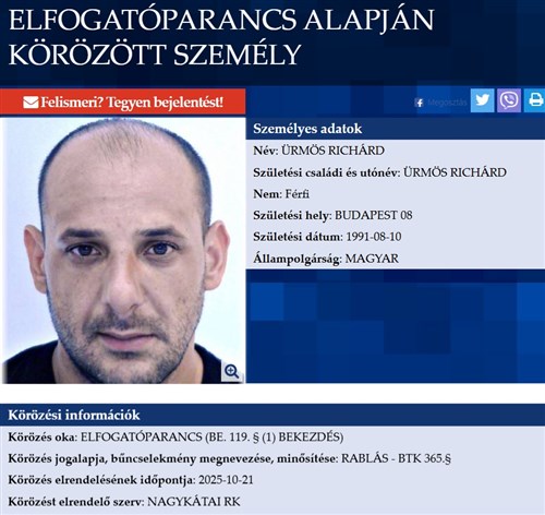 A beszerzett adatok és felvételek alapján a rendőrök keresik a bűncselekménnyel összefüggésbe hozható Ürmös Richárd 34 éves tápiószecsői lakost.