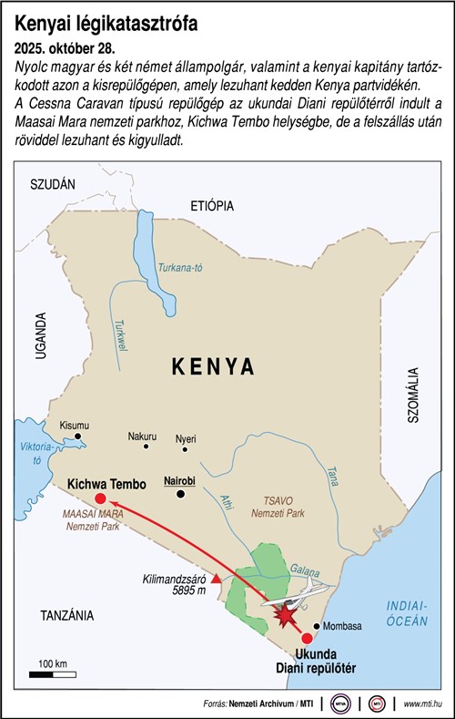 Nyolc magyar és két német állampolgár, valamint a kenyai kapitány tartózkodott azon a kisrepülőgépen, amely lezuhant kedden Kenya partvidékén, Kwale megyében; a légikatasztrófának nincsenek túlélői - közölte a gépet üzemeltető Mombasa Air Safari légitársaság.
