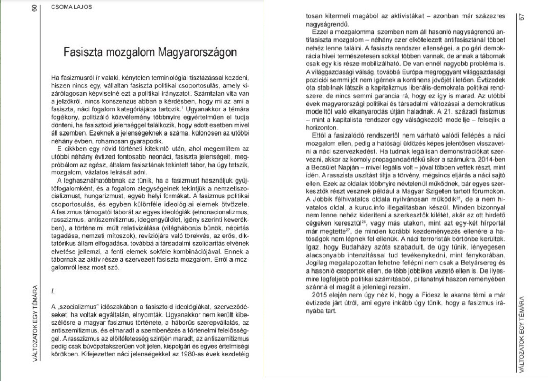Csoma a "fasiszta mozgalomról" szóló cikkét az Eszmélet nevű szélsőbaloldali lapban publikálta. Érdemes az olvasott szövegen elgondolkodni. Csoma már ebben is aktív fellépést sürget a jobboldali szervezetek ellen, mivel a rendőri intézkedést nem tartja elégségesnek, köztük a Kuruc.infóval szemben sem.