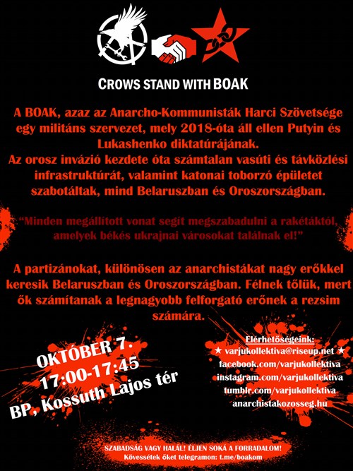 Fentebb említettem a Varjú Kollektívát. Eltekintve attól, hogy mit gondolunk az orosz-ukrán konfliktusról, s jobbról vagy balról kritizáljuk a putyini Oroszországot, mindenképpen említésre méltó, hogy a varjak kikkel is vállalnak szolidaritást, és kik mellett demonstrálnak. Alábbi plakátjukat két éve tették közzé, melyben szolidaritásra hívnak fel az orosz, fehérorosz és ukrán Anarcho-Kommunisták Harci Szövetségének (BOAK) tagjai mellett. A BOAK katonai épületeket, vasúti- és távközlési hálózatot támad, robbant, gyújt fel a hátországban. Az ilyen cselekményeket a világ minden országában, politikai rendszertől függetlenül terrorizmusként és hazaárulásként tartják számon, pláne hadiállapotban. A varjak terroristák melletti demonstrációjukat teljesen legálisan szervezték és megtartották, a hatóságok érdeklődést sem mutattak.