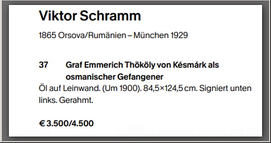 Ha lehet hinni a világhálós hirdetésnek, a müncheni Karl & Faber Aukciósházban néhány nap múlva, 2025. november 14-én kalapács alá kerül Schramm Viktor „Késmárki Thököly Imre mint az oszmán fogoly” című történelmi festménye (A műalkotás helyes, magyar címe: Thököly Imre elfogatása a nagyváradi pasa által – H. J.). Schramm Viktor nevezett történelmi festményét az 1896-os millenniumi ünnepségek keretében, az Ezredéves Országos Kiállításon ismerhette meg első ízben a nagyközönség a budapesti Műcsarnokban. A műalkotás jelentősége - és egyáltalán a létezése - a millenniumi kiállítás óta eltelt közel 130 esztendő alatt szinte teljesen eltűnt a nemzeti örökségünket megtartó emlékezetünkből.