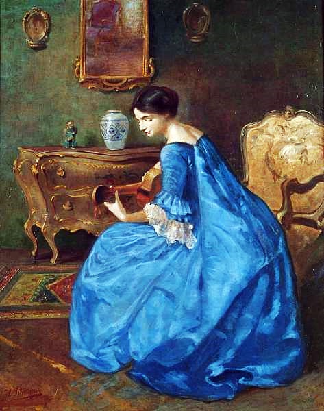 Schram Viktor: Kékruhás fiatal nő gitárral