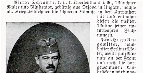Viktor Schramm, a k.u.k. nyugalmazott főhadnagya, müncheni festő és illusztrátor, aki a magyarországi Orsovában született, részt vett a Kárpátokban vívott heves harcokban, és természethű rajzai motívumainak nagy részét is onnan merítette.