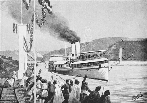 Az I. Ferenc József gőzhajó - fedélzetén három uralkodóval - a két part között kihúzott lánc átszakításával megnyitja a Vaskapu-csatornát (Schramm Viktor rajza)