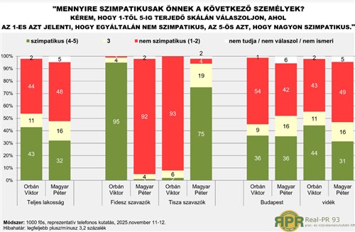 Orbán Viktor népszerűbb Magyar Péternél, a Tisza szavazóinak csupán 75 százaléka tekinti szimpatikusnak saját pártjának elnökét, a Fidesz-tábor viszont egységesen sorakozik fel Orbán Viktor mögött - közölte az MTI-vel szombaton kutatásának eredményeire hivatkozva a debreceni székhelyű Real-PR 93. országos és helyi közvélemény-kutatásokkal foglalkozó cég.