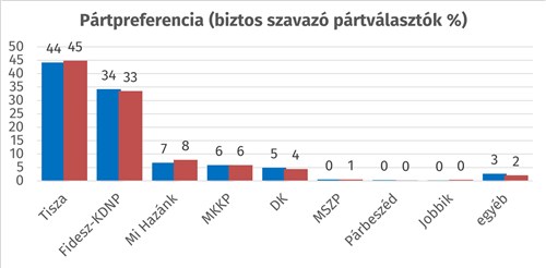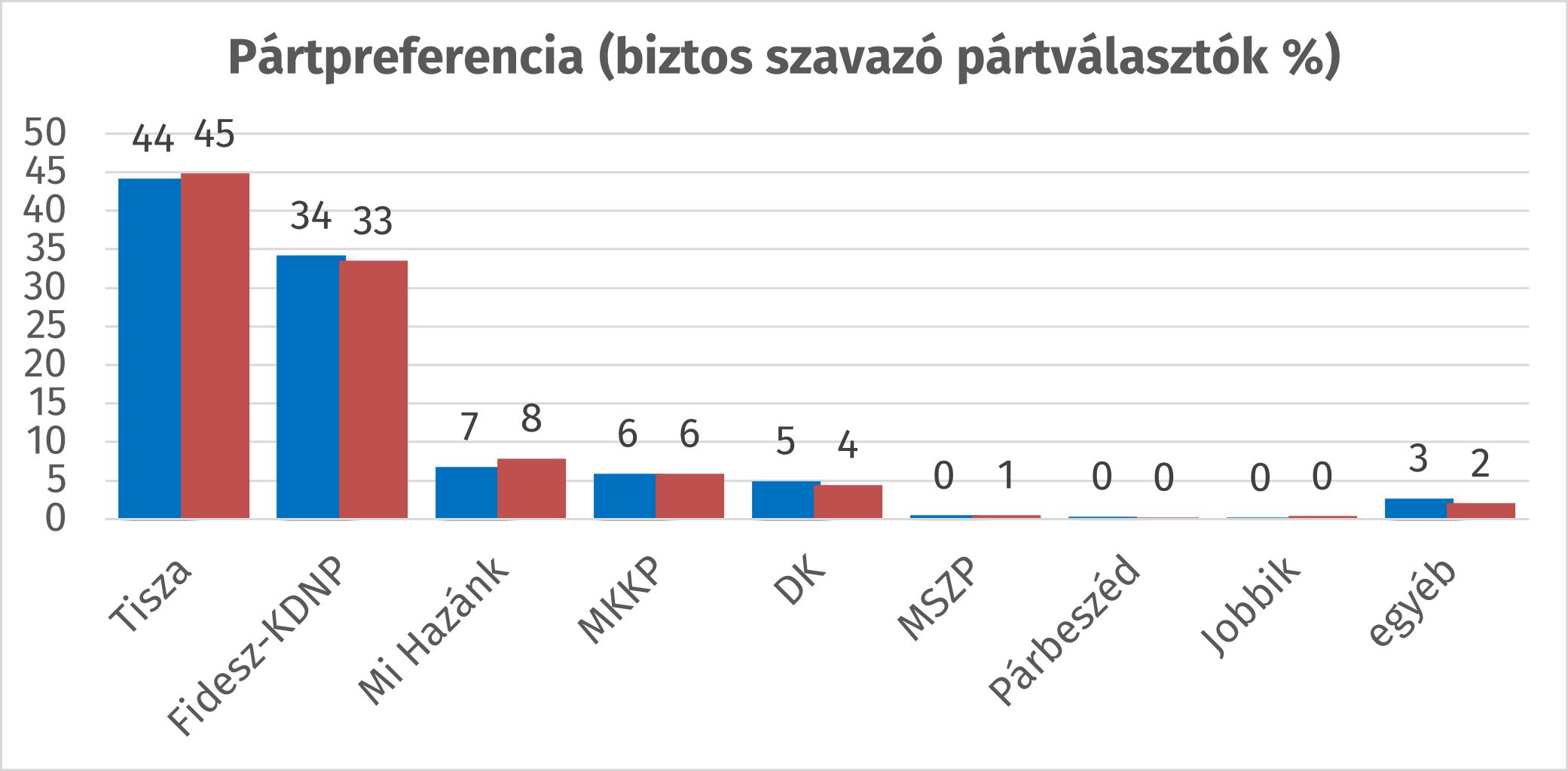 Az egyetlen szemmel látható, bár hibahatáron belüli változás a biztos szavazó pártválasztók körében történt: a Tisza itt 1 százalékpontot erősödött, 45 százalékra, a Fidesz–KDNP pedig 1 százalékponttal esett vissza, 33 százalékra. A különbség így 12 százalékpont a Tisza javára a biztos szavazók körében.