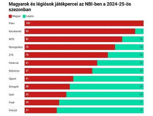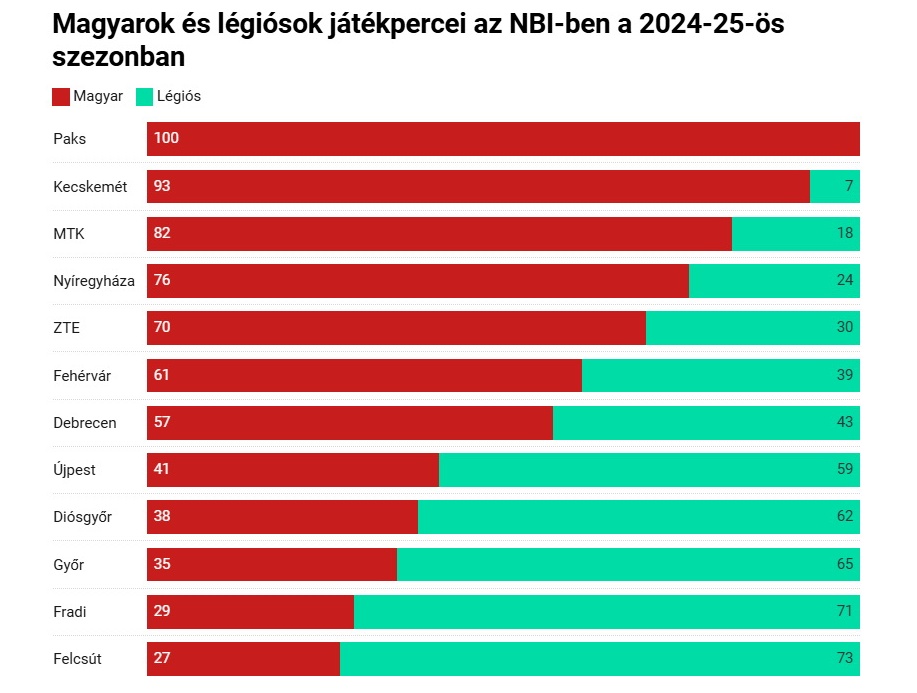 Az MLSZ elemezte külön azt is, hogy csapatonként hogyan alakult a magyar-légiós játékpercek aránya. Hagyományosan a Paks az egyetlen, amelyik csak magyar játékosokat foglalkoztat, így is dobogóra tudott lépni, csak két, légiósokat ipari méretekben szerződtető klub tudta megelőzni. Nagyon magas volt a magyar játékosok játékperce Kecskeméten is, apró probléma, hogy a csapat a szezon végén kiesett az NB I-ből. A másik kieső az a Fehérvár volt, ahol szintén valamivel átlag feletti volt a magyaroknak jutó játékperc.