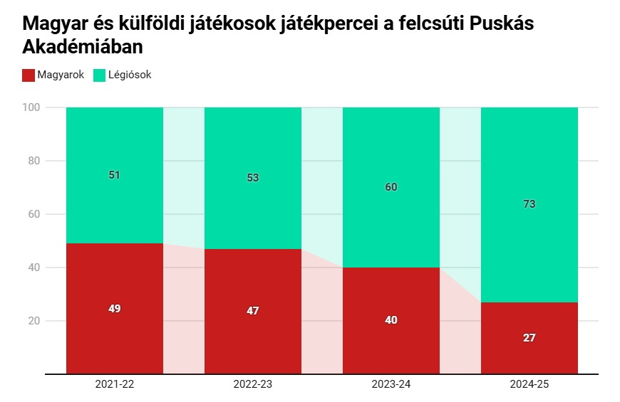 Ami viszont erősen meglepő egy magát a világ legjobb utánpótlásnevelő műhelyei között emlegető klubnál: a felcsúti Puskás Akadémiában volt a legmagasabb a légiós játékpercek aránya a tavalyi szezonban.
