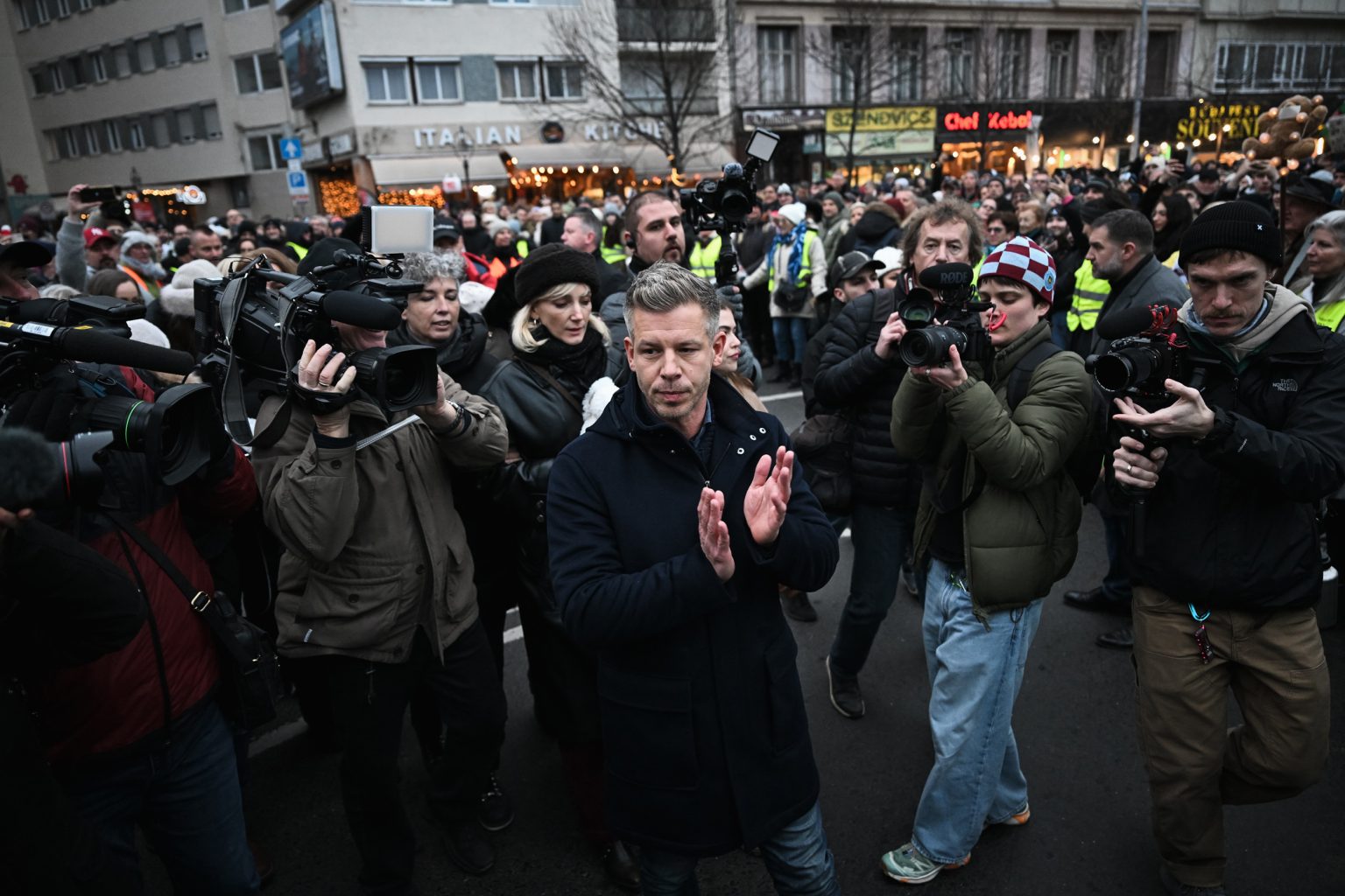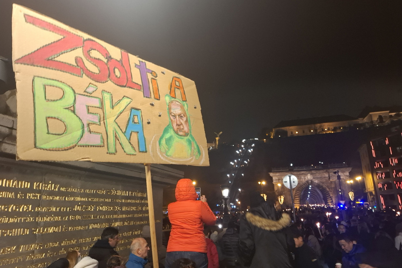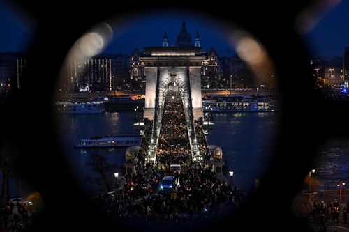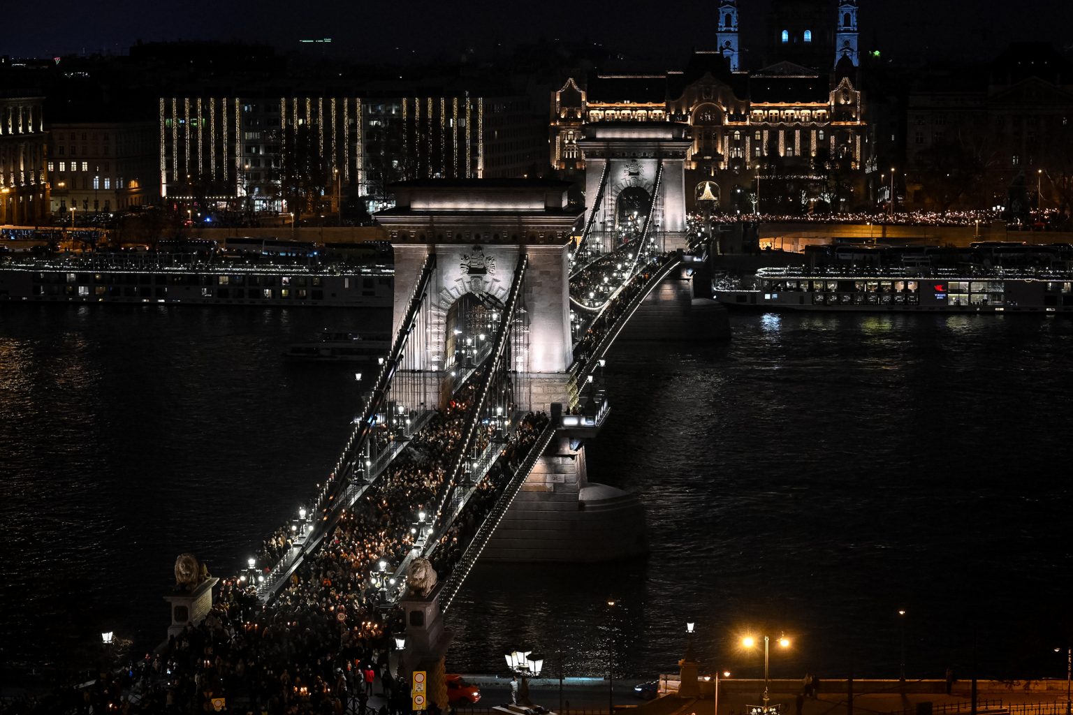 Az MTA elé érve kérték arra az embereket, hogy most gyújtsák meg a gyertyákat, fáklyákat. A menet előtt pedig egy kisteherautó, amelyikről komolyzene szól. Amikor a Lánchídhoz értek az emberek, már kifejezetten nagy tömeg vonult. A transzparens mögött az első sorban olyanok állnak Magyar Péter mellett, mint Rost Andrea, Forsthoffer Ágnes, Bódis Kriszta vagy Borbély Alexandra színésznő. A menet vége még csak négy óra után hagyta el a Deák teret, miközben az eleje már a Lánchídon vonult.