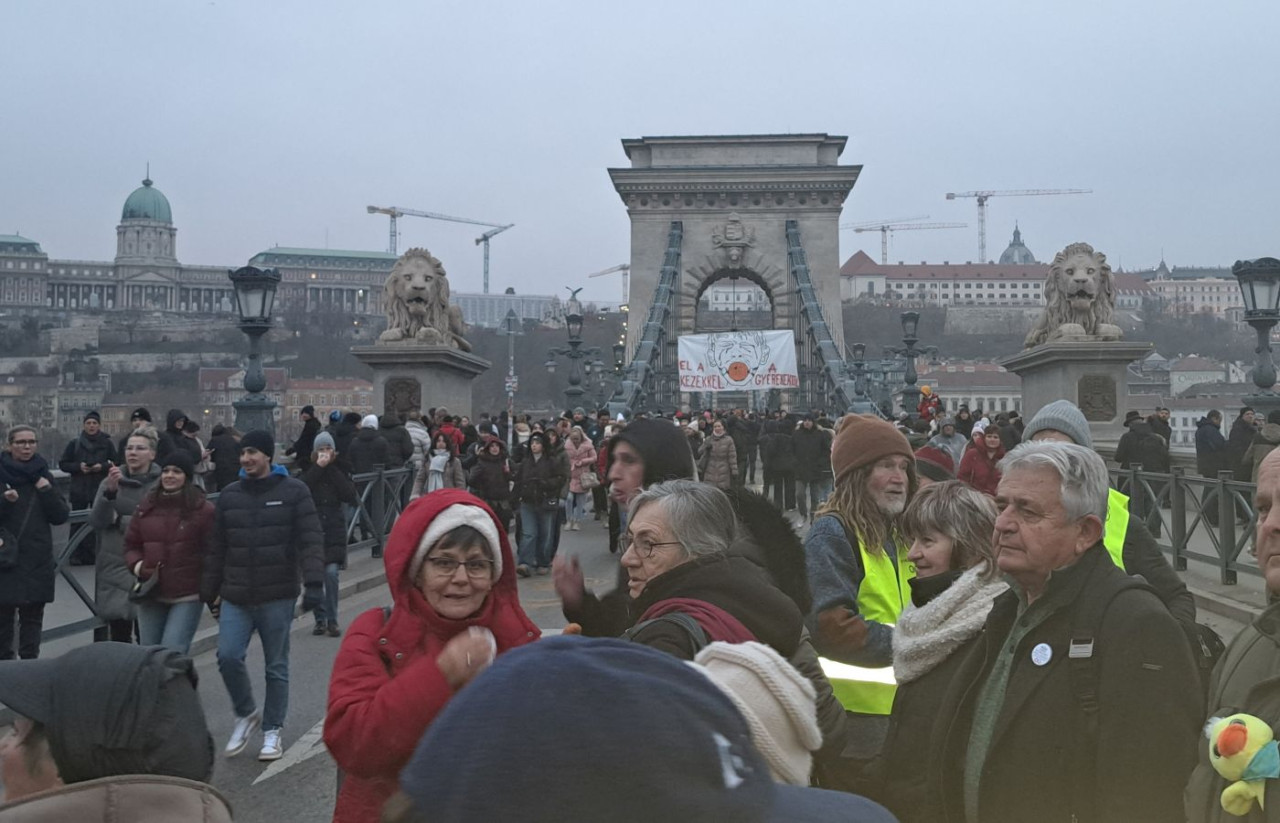Mint kiderült, ez nem egy tiszás transzparens, két Fejér megyei tiszás tette ki azt. A lapnak arról beszéltek, most lett elegük abból, ami zajlik, és hirtelen felindulásból készítették el a plakátot. A lezárt Lánchídon egyébként sokan sétálnak, főleg turisták, de vannak, akik a tiszás rendezvényre érkeztek, és a Deák tér helyett rögtön ide jöttek.
