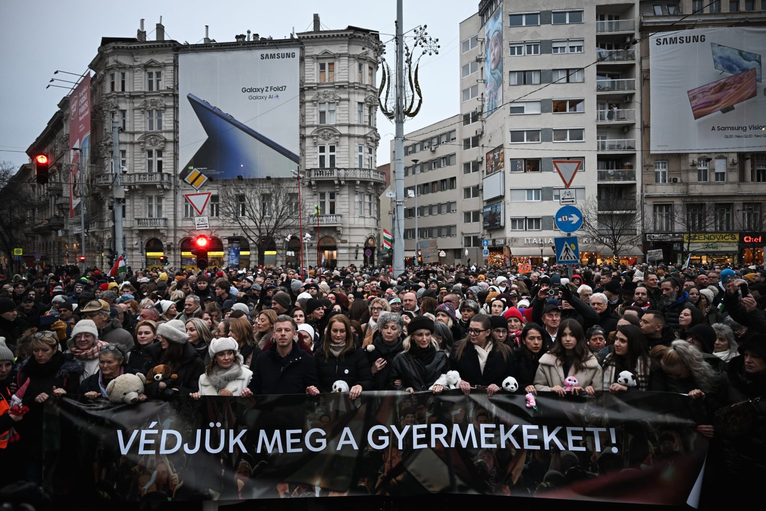 Fél négy előtt nem sokkal érkezett meg Magyar Péter a Deák térre. A Tisza Párt elnökének kérésére többen hoztak gyermekjátékokat is (különösen a 17 évesesen erőszaktevő Kalányos Odüsszeusz várja kisírt gyermekszemekkel remegve a plüssnyulakat a javítóintézetben - a szerk.), a menet eleje a Paulay Ede utca elejére állt be, hogy aztán a Karmelitáig vonuljanak. Fél négykor meg is indult a tömeg. Magyar egyébként szombat délelőtti nyílt levelében meghívta Sulyok Tamás államfőt is a demonstrációra. Több tiszás politikust is láttak tudósítóink a tömegben, többek között Tarr Zoltánt, Kulja Andrást és Rost Andreát. Közben a Lánchídon is láthastó volt egy méretes transzparens, rajta az „El a kezekkel a gyerekektől” felirattal.
