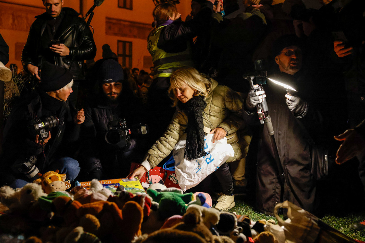 Egészen kis emelvényen szólal ezúttal fel Magyar Péter, akik pedig hoztak magukkal játékokat, azok egy gyűjtőhelyen, a színpad előtt adhatják le azokat.