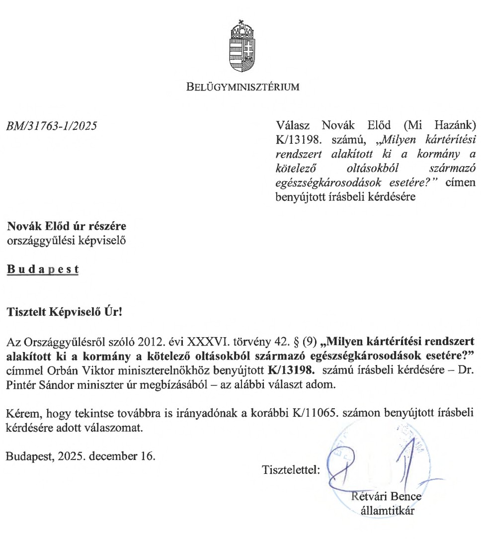 Jelenleg azonban nem ismert olyan állami, átlátható, előre rögzített szabály- és garanciarendszer, amely kifejezetten a kötelező védőoltásokból eredő súlyos egészségkárosodás vagy maradandó rokkantság esetén gyors, pereskedés nélküli, egységes eljárás keretében biztosítana kártalanítást – írta a politikus.