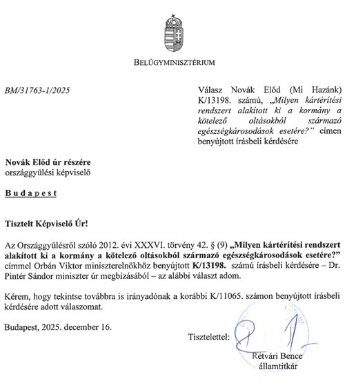 Novák Előd arra hívta fel Orbán Viktor figyelmét, hogy Magyarországon Európa egyik legszigorúbb és legkiterjedtebb kötelező védőoltási rendszere működik. Mint említette, a kötelezőség eltörlése a céljuk uniós mintára, de mivel eddig nem tudtak előre lépni, ezért a következő kérdések merültek fel. Ha ilyen szigorú oltási rendszer van, akkor szerinte elvárható lenne, hogy ha az állam kötelező jelleggel beavatkozik a gyermekek egészségébe, akkor teljes körű, átlátható és méltányos kártérítési rendszert biztosítson az esetlegesen bekövetkező oltási károsodások esetén.