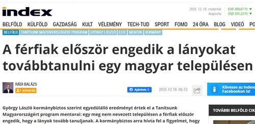 „Áttörés: a férfiak először engedik a lányokat továbbtanulni az egyik településen, ahol jelen vannak a Tanítsunk Magyarországért Program mentorai” – kezdte Facebook-bejegyzését György László gazdasági stratégiákért és a Tanítsunk Magyarország program irányításáért felelős kormánybiztos. A település nevét szándékosan nem írta le, pedig ha megtette volna, akkor talán nem írta volna a Zsindex azt, hogy magyar településről van szó. Bár a gyerekotthonnak hazudott javítóintézet után persze bármi lehetséges.