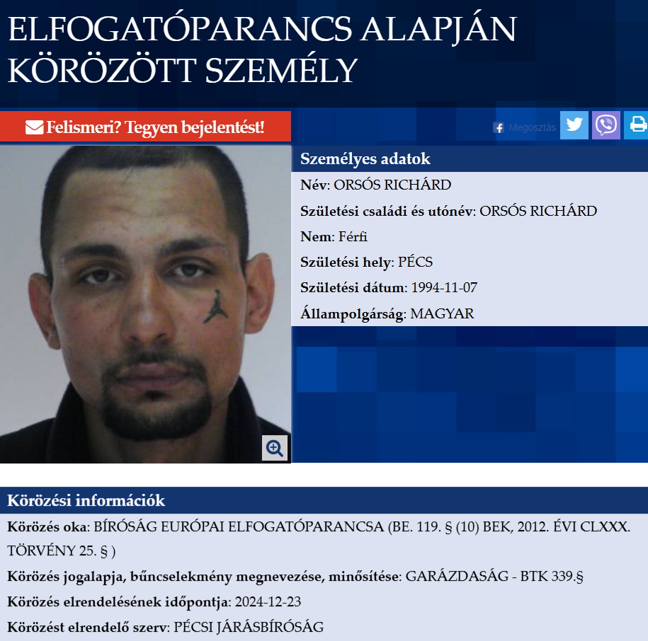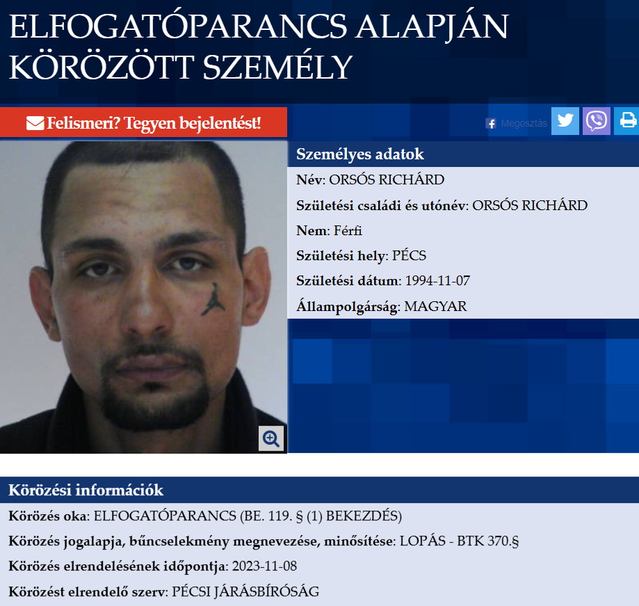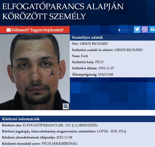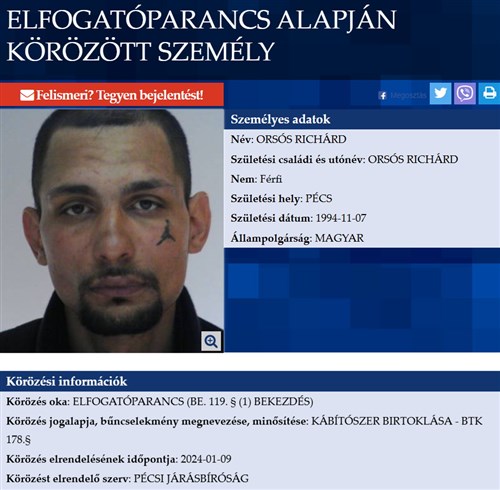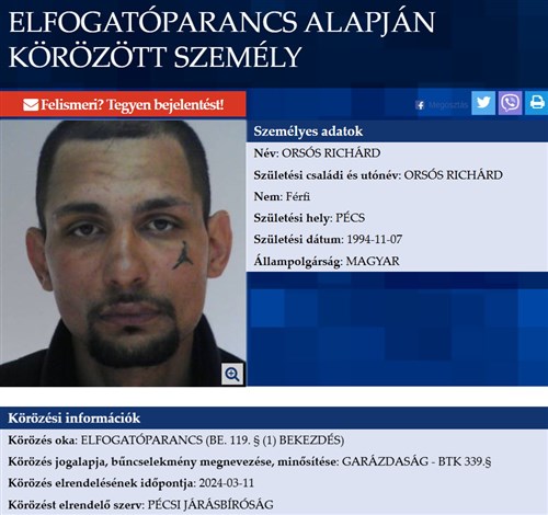 A Pécsi Járásbíróság elfogatóparancsot adott ki Orsós Richárd ellen, a hatóságok a lakosság segítségét kérik a férfi felkutatásában, írja a Zsaruhírek.