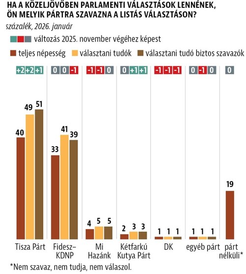 A Medián január első felében elvégzett mérése szerint a teljes népesség körében a Tisza 2 százalékponttal tudott erősödni, míg a Fidesz stagnált, a választani tudó biztos szavazók körében pedig még gyengült is.