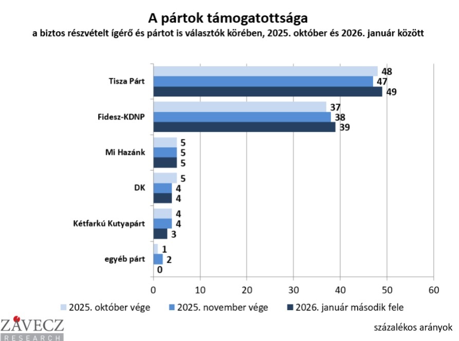 Folytatódott Tisza és a Fidesz-KDNP táborának bővülése: előbbi tavaly nyár óta 32-ről 36 százalékra erősödött, utóbbi 26-ról 31 százalékra, derül ki a Závecz Research legfrissebb, január második felében végzett közvélemény-kutatásából.