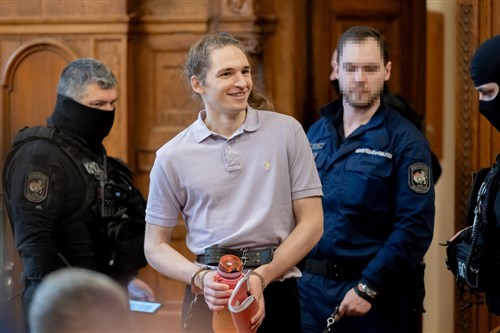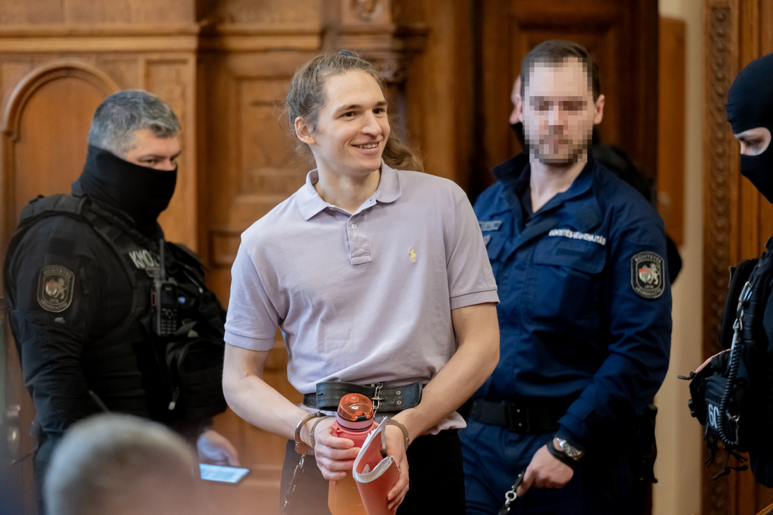 A német vádlottat már megszokott módon a büntetés-végrehajtás őrei kísérték be, egy gyors mosoly és integetés kíséretében nézett a támogatóira, akik hangos tapsviharral köszöntötték viszont, erre a magyar padsorokból többen pfujolással reagáltak.