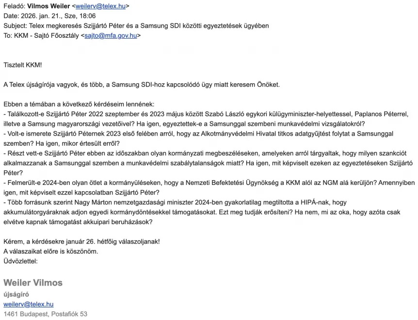 Szijjártó arra a hétfői cikkre reagált, amelyben azt írták, hogy a Samsungban 2022-ben rendkívül súlyos munkavédelmi hiányosságok voltak, és erről a kormányban is tudtak. Több, egymástól független forrásra hivatkozva azt is közölték, hogy a problémák miatt annak idején Rogán Antal a gyár bezáratása ellen érvelt, míg Szijjártó a Samsung támogatói közé tartozott.