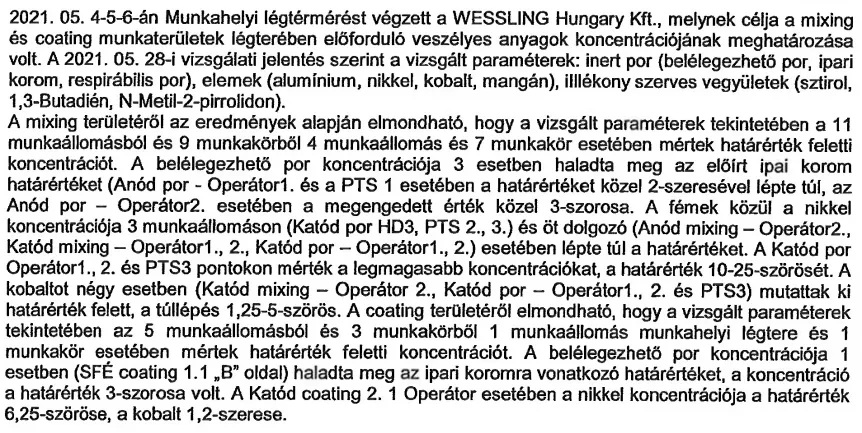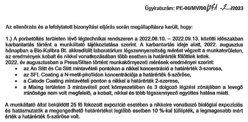 A dokumentumban pedig szerepel az az ominózus légtérmérés is, amelyen a határértéket többszázszorosan meghaladó vegyianyag-koncentráció jött ki. Egészen pontosan március 9-én mérték a notching területen a 7-es és 8-as számú operátor légszennyezését, ahol a kobalt koncentrációja a határérték 15,8-szorosa, a nikkelé pedig 265,9-szerese volt. Az összes légszennyező anyag kombinált hatása 275,4-szeres határérték-túllépésre jött ki.
