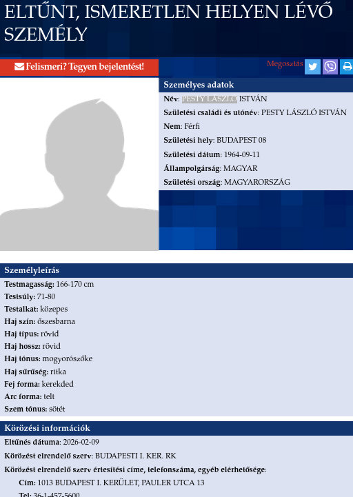 Eltűnt, ismeretlen helyen lévő személyként jelent meg a rendőrség oldalán Pesty László dokumentumfilmes, a Pesty Fekete Doboz alapítója, a gerilla.hu alapítója – írta meg a Telex. A körözést az I. kerületi rendőrkapitányság rendelte el, az eltűnés dátumának február 9-ét, hétfőt adták meg.
