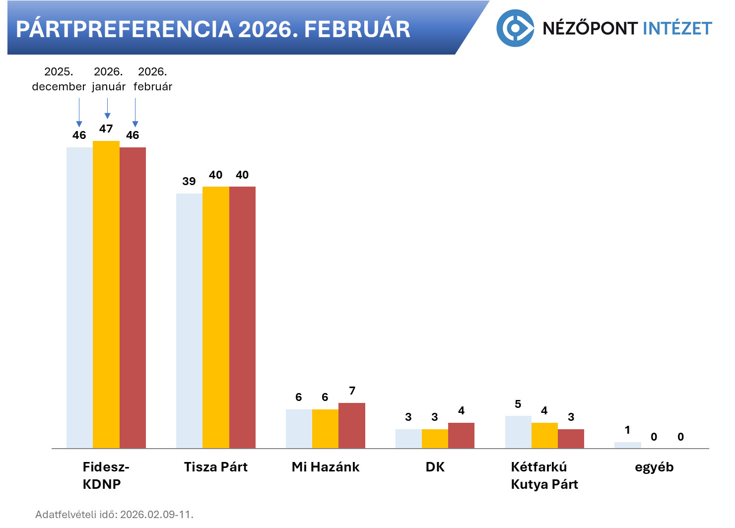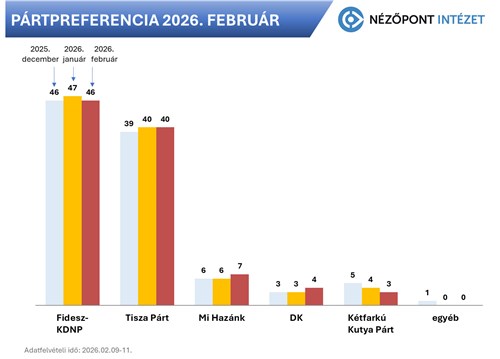 Február elején, alig kilenc héttel a választások előtt zajló adatfelvétel során, a választáson várhatóan önálló listát állító pártok erősorrendje és támogatása is változatlan. „Most vasárnap” a Fidesz-KDNP listája a szavazatok 46 százalékát szerezné meg, amely változatlanul a 2024-es EP-választásokhoz közeli eredménye lenne a kormánypártoknak. A Fidesznek ráadásul mintegy 2-3 százezer inaktív szimpatizánsa van még, a kampány végére a kormánypárt az ő mobilizálásukkal még javíthat is az eredményén.