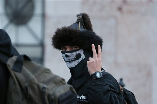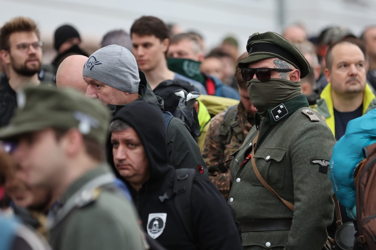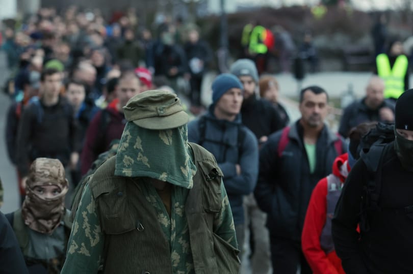 Terepszínű ruha, arcot eltakaró kendő, túrabotok – több ezren ebben az egyenruhában várták a budai Várnál, hogy elinduljon a kitörés napi túra délután, a szervező becslése szerint körülbelül 4 ezren jöttek el.