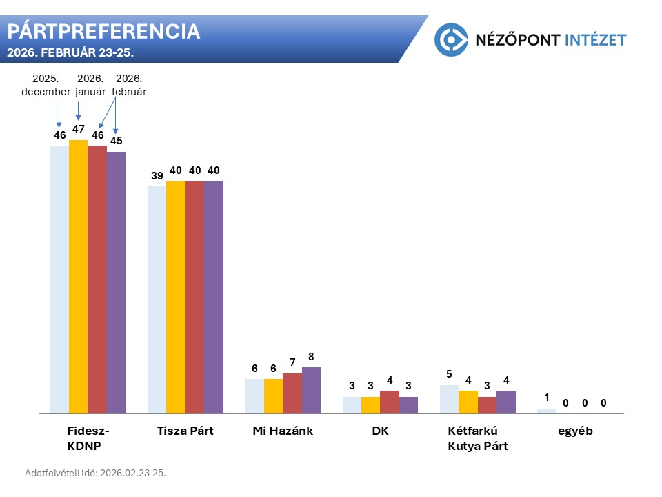 A hivatalos kampányidőszak megkezdése után készített felmérés alapján a Nézőpont Intézet szerint nincs érdemi változás a pártok versenyében. A kormánypárt előnye a Tisza Párttal szemben változatlanul magas. Sem a gödi akkumulátorgyár, sem Magyar Péter "kábítószergyanús anyaggal" kapcsolatos ügye nem mozgatta meg az erőviszonyokat. Egy "most vasárnapi" választáson a legvalószínűbb listás eredmény, amely az összes részvételét biztosra mondó válaszadó pártpreferenciáját figyelembe veszi, alapján a Fidesz-KDNP listája 45, a Tisza Párt listája 40 százalékot kapna, amely megfelel az elmúlt hetek eredményeinek - írja a fideszes intézet.