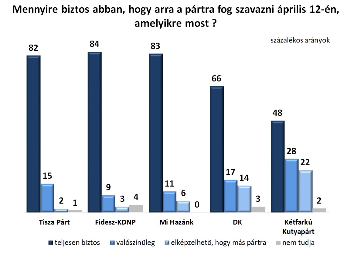A kisebb pártok közül a Mi Hazánk hívei is elkötelezettek, 83 százalékuk biztosra veszi, 11 százalékuk valószínűsíti, hogy áprilisban is erre a pártra fogja a voksát adni. A DK és a Kétfarkú Kutyapárt támogatói korántsem ennyire magabiztosak a mostani preferenciájuk jövőbeni alakulását illetően: előbbiek kétharmada fele teljesen biztos abban, hogy kitart a választásig, és még további egyötödük is valószínűsíti ezt. A Kutyapárt támogatóinak fele biztos, egynegyede valószínűnek tartja, hogy április 12-én erre a pártra voksol. Ugyanakkor a DK-sok 14 százaléka, a Kutyapárt támogatóinak 22 százaléka gondolkodik azon, hogy esetleg más pártra szavaz.